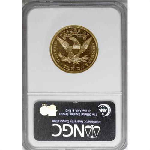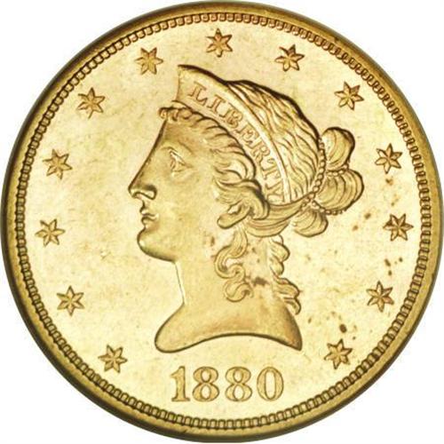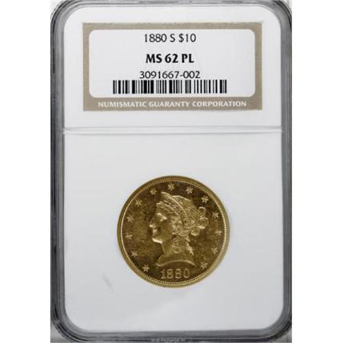 <B>1880-S $10 MS62 Prooflike NGC.</B></I> This is the highest grade most collectors will encounter of the 1880-S eagle, as it is downright rare any finer. The prooflike surfaces of this MS62 example yield pleasing field-motif contrast, especially on the reverse, and a sharp strike emboldens the design elements. Light contact marks, particularly on the obverse, limit the grade.<BR><BR><B>Coin Engraver:</B> Christian Gobrecht<BR><BR><b>Shipping:</b> Coins & Currency (<a target="_blank" href="http://www.heritageauctions.com/common/shipping.php">view shipping information</a>)