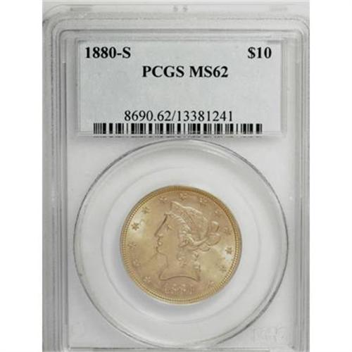 <B>1880-S $10 MS62 PCGS.</B></I> The yellow-orange and peach surfaces of this satiny San Francisco eagle show light, wispy abrasions. The solidly defined devices display few marks for the grade assigned. PCGS has certified 31 finer examples (11/07).<BR><BR><B>Coin Engraver:</B> Christian Gobrecht<BR><BR><b>Shipping:</b> Coins & Currency (<a target="_blank" href="http://www.heritageauctions.com/common/shipping.php">view shipping information</a>)