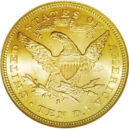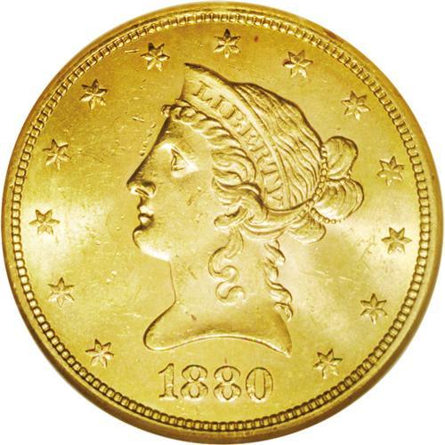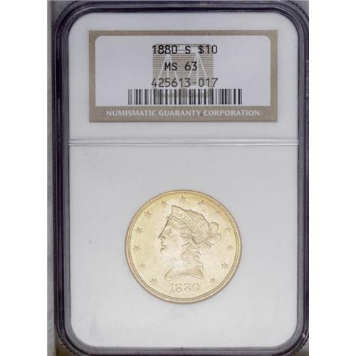 <B>1880-S<$10> MS63 NGC.</B></I> The 1880-S is an underappreciated conditional rarity, available in abraded Mint State grades but elusive at the MS63 level. The present meticulously struck and thoroughly lustrous example has relatively clean fields and a few light facial marks. Census: 18 in 63, 1 finer (2/06).