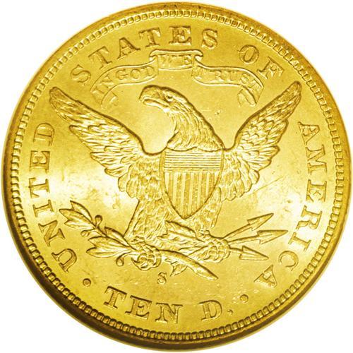 <B>1880-S<$10> MS63 NGC.</B></I> This boldly struck eagle has full cartwheel luster, and although light abrasions are present, the only individually relevant mark is an unobtrusive pinscratch beneath the right (facing) wing. The 1880-S is available in AU58 to MS62 grades, but Select examples are surprisingly scarce. Census: 19 in 63, 1 finer (9/06).