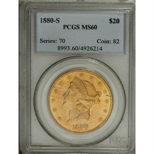 <B>1880-S $20 MS60 PCGS.</B></I> PCGS Population (35/154). NGC Census: (79/189). Mintage: 836,000. Numismedia Wsl. Price for NGC/PCGS coin in MS60: $850. (#8993)<BR><BR><B>Coin Engraver:</B> James B. Longacre<BR><BR><b>Shipping:</b> Coins & Currency (<a target="_blank" href="http://www.heritageauctions.com/common/shipping.php">view shipping information</a>)