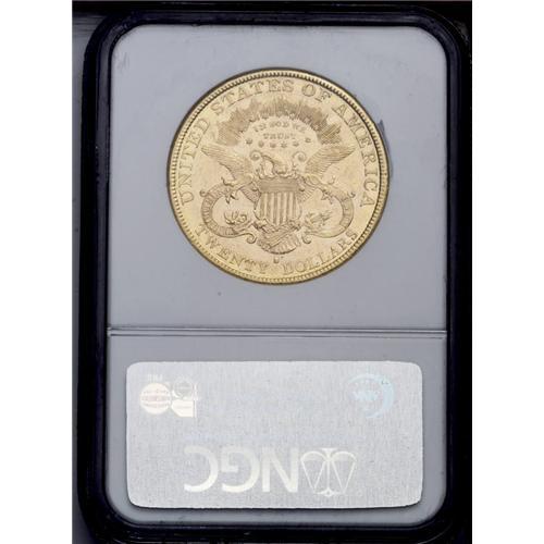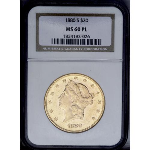 <B>1880-S<$20> MS60 Prooflike NGC.</B></I> The only prooflike Mint State example of this issue certified by NGC or PCGS (7/06). A reflective and solidly struck wheat-gold coin with far better eye appeal than the grade would suggest.<BR><I>From The New York Eye Appeal Collection.</B></I>
