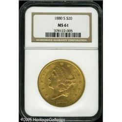 <B>1880-S $20 MS61 NGC.</B></I> A bright, lightly abraded example with sparkling luster in the fields. A conditionally scarce S-mint.<BR><I>From The Richard J. Chouinard Collection of United States Coins, Part Two.</B></I> Lot:9161