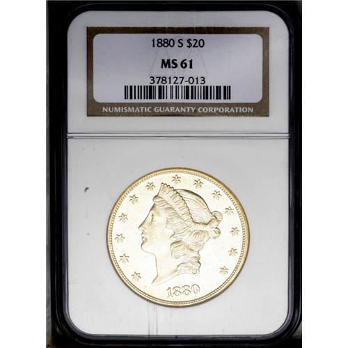 <B>1880-S<$20> MS61 NGC.</B></I> Sharply struck and highly lustrous with excellent eye appeal. The surfaces are lightly abraded, but there are no individual distracting marks. It is not unusual to find an 1880-S in the various levels of AU, but flashy Mint State pieces such as this are scarce and underappreciated. <BR><BR><B>Important notice:</B> Heritage usually auctions material at the rate of 200-250 lots per hour. On some occasions eBay Live bid software or the Internet may not be able to keep up with the pace of the auction. We recommend placing a realistic absentee bid now as insurance to avoid disappointment. Occasionally the auctioneer may eliminate or reject an eBay Live bid, and the auctioneer may also reopen a lot after the close of the eBay live bidding (usually because we missed an audience bid), and may reject your bid even if it shows you as the winning bidder. By bidding via eBay Live, you agree that Heritage may award the lot to another bidder at its sole discretion under the circumstances described above or any other reasonable circumstances. Since eBay bids are not shown to us until we open the lot on the floor, we treat those bids just like floor bids. In most cases the floor responds before the eBay bid is presented to us, due to Internet lag time, so for consistency we have made it a policy that floor bids are always considered first over tie eBay live bids. Also please note that all Heritage lots purchased through eBay Live carry a 20% Buyer's Premium. Please make sure you read the Terms and Conditions before you bid. This lot is being auctioned in conjunction with a live floor auction by Heritage Galleries & Auctioneers. All final auction and invoice information will be supplied by Heritage Galleries & Auctioneers, and all other information should be considered preliminary. Lot:4283 <BR><BR><B>Winning Notification and Billing:</B> After the FINAL session in this auction is complete, Heritage will send e-mail and snail mail invoices. This process normally takes several days. All final auction and invoice information will be supplied by Heritage Galleries & Auctioneers, and all other information should be considered preliminary. <BR><BR>This auction will be conducted on a live auction floor and over the Internet through eBay Live. If you choose to place an absentee bid, please take a moment to <font color='#0000ff'><u><a href='http://pages.ebay.com/liveauctions/help/before/laabsentee.html'>learn how eBay Live absentee bidding works</a></u></font><font color='#000000'>