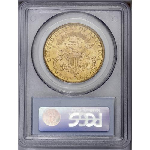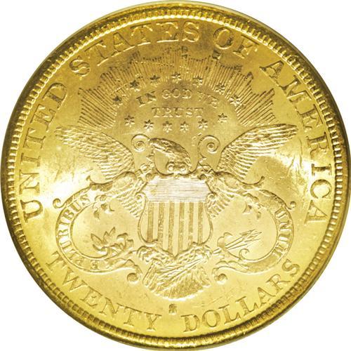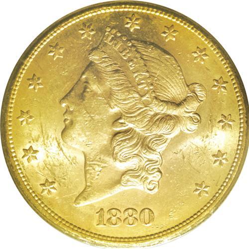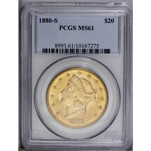 <B>1880-S<$20> MS61 PCGS.</B></I> Green-gold and wheat combine in the surfaces of this highly lustrous Mint State double eagle. The strike is unusually strong for this issue, with great detail on both sides. As expected for the grade, the fields and devices show moderate abrasions, especially on the neck and to its right.
