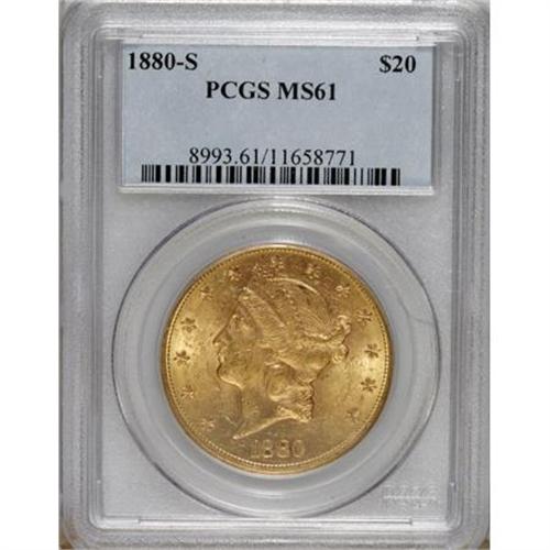 <B>1880-S $20 MS61 PCGS.</B></I> A softly lustrous, unworn example of this higher-mintage San Francisco issue, solidly struck with muted apricot-gold and wheat colors. The surfaces display myriad light marks that combine to limit the grade.<BR><BR><b>Shipping:</b> Coins & Currency (<a target="_blank" href="http://www.heritageauctions.com/common/shipping.php">view shipping information</a>)