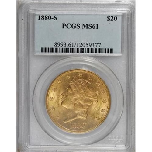 <B>1880-S $20 MS61 PCGS.</B></I> The 1880-S was extensive overseas trade, resulting in most survivors being well circulated (Jeff Garrett and Ron Guth, 2006). The peach-gold surfaces of this MS61 example display nearly uninterrupted luster and well struck design elements. Light marks are evenly distributed over the faces of both sides.<BR><BR><B>Coin Engraver:</B> James B. Longacre<BR><BR><b>Shipping:</b> Coins & Currency (<a target="_blank" href="http://www.heritageauctions.com/common/shipping.php">view shipping information</a>)