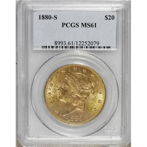 <B>1880-S $20 MS61 PCGS.</B></I> . PCGS Population (91/68). NGC Census: (145/45). Mintage: 836,000. Numismedia Wsl. Price for NGC/PCGS coin in MS61: $1,600. (#8993)<BR><BR><B>Coin Engraver:</B> James B. Longacre<BR><BR><b>Shipping:</b> Coins & Currency (<a target="_blank" href="http://www.heritageauctions.com/common/shipping.php">view shipping information</a>)