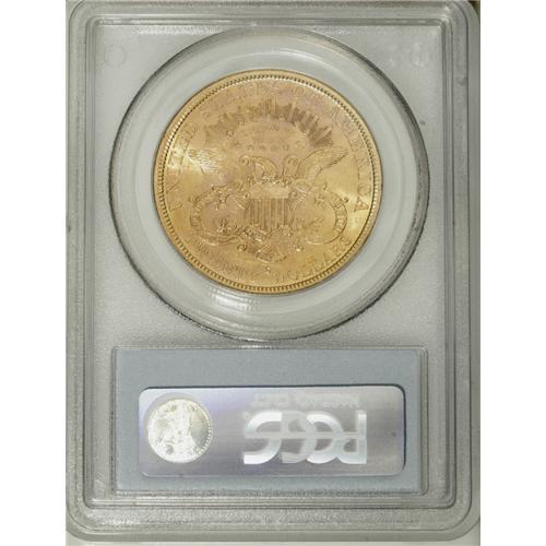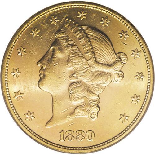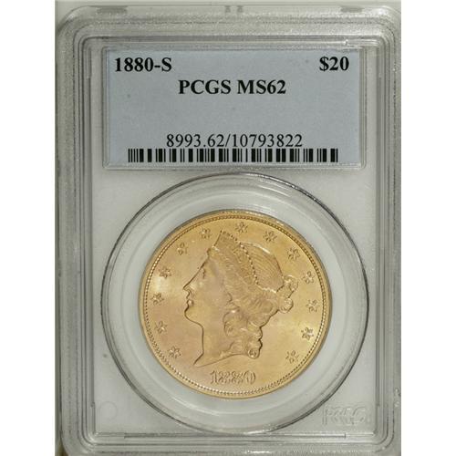 <B>1880-S $20 MS62 PCGS.</B></I> A luminous salmon-pink and honey example of this conditionally rare double eagle. Booming luster sweeps the typically abraded fields and devices. The strike is sharp, even on Liberty's hair curls, which usually exhibit some softness. Population: 51 in 62, 4 finer (12/06).<BR><BR><b>Shipping:</b> Coins & Currency (<a target="_blank" href="http://www.heritageauctions.com/common/shipping.php">view shipping information</a>)