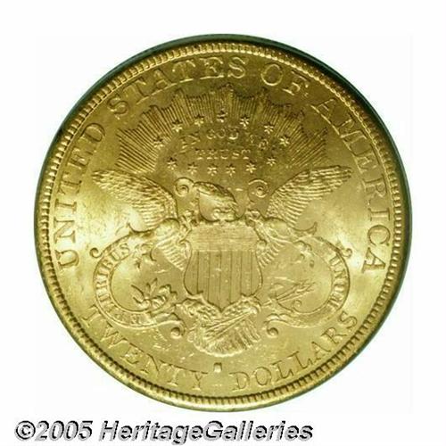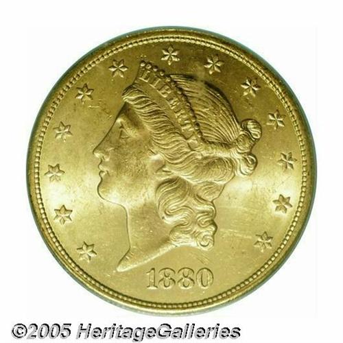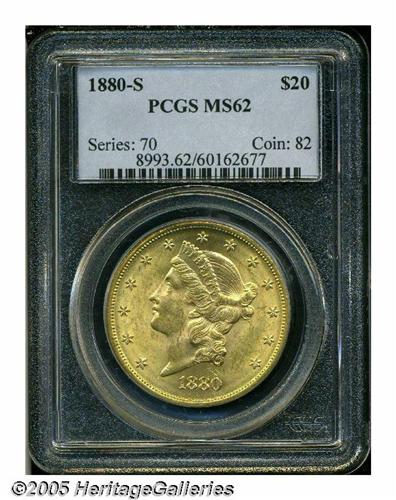 <B>1880-S<$20> MS62 PCGS.</B></I> Lustrous and brilliant with great eye appeal for the grade. Despite a generous mintage of 836,000 pieces, it appears that only a few hundred Uncirculated examples have survived to adorn the cabinets of numismatists. Here's a prize certain to please the collector who pursues pieces that combine the dual attributes of scarcity and aesthetic charm.