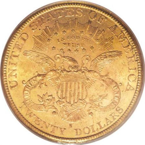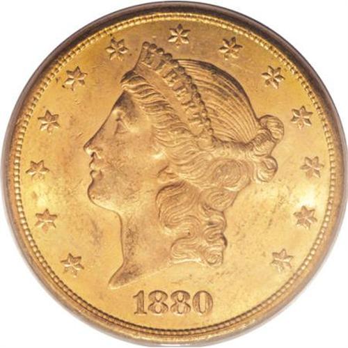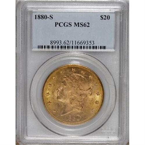 <B>1880-S $20 MS62 PCGS.</B></I> Well struck with semi-prooflike fields that show just a slight degree of cloudiness. Both sides of the piece have a mildly scuffy appearance that limits the grade. The '80-S is a conditionally scarce issue in Mint State, despite its substantial mintage of 836,000 coins. Only twelve examples have been graded finer than MS62, by PCGS and NGC combined (6/07). <BR><BR><b>Shipping:</b> Coins & Currency (<a target="_blank" href="http://www.heritageauctions.com/common/shipping.php">view shipping information</a>)