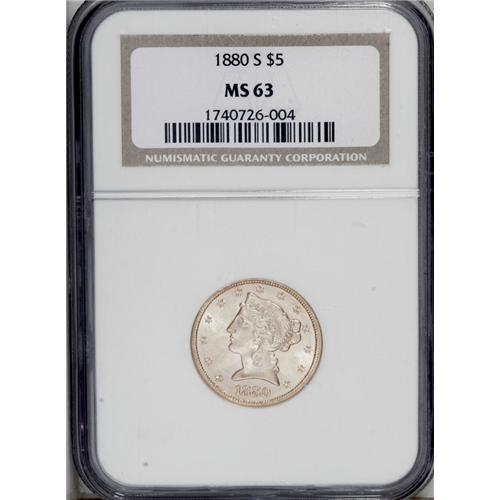 <B>1880-S $5 MS63 NGC.</B></I> Crisply struck with bold, almost flashy luster and pleasing straw-gold color. Scattered abrasions appear in the fields and on the devices.<BR><BR><b>Shipping:</b> Coin/Currency (<a target="_blank" href="http://www.heritageauctions.com/common/shipping.php">view shipping information</a>)