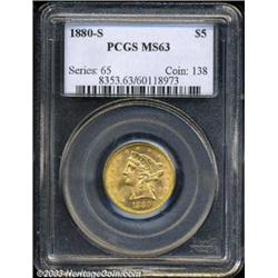 <TABLE cellSpacing=0 cellPadding=0 width="100%" bgColor=#000000 border=0><TBODY><TR><TD width="100%"><TABLE cellSpacing=1 cellPadding=3 width="100%" border=0><TBODY><TR><TD width="100%" bgColor=#79735c><FONT face=arial color=#ffffff size=3><B>Description</B> </FONT></TD></TR><TR><TD width="100%" bgColor=#ffffff><FONT face=arial size=2><B>1880-S $5 MS63 PCGS.</B></I> Well struck with showy luster and gleaming orange-yellow radiance. The reverse is lightly marked, while there are numerous small surface abrasions on the obverse. Population: 110 in 63, 29 finer (8/03). </FONT></TD></TR></TBODY></TABLE></TD></TR></TBODY></TABLE><BR><A name=PricesRealized></A><TABLE cellSpacing=0 cellPadding=0 width="100%" bgColor=#000000 border=0><TBODY><TR><TD width="100%"><TABLE cellSpacing=1 cellPadding=3 width="100%" border=0><TBODY><TR><TD width="100%" bgColor=#79735c><A name=PR><FONT face=arial color=#ffffff size=3><B>Previous Prices from Heritage Auctions</B> </FONT></A></TD></TR><TR><TD bgColor=#f6f6ed><TABLE cellSpacing=0 cellPadding=0 width="100%" border=1><TBODY><TR><TD align=middle width="33%"><B>Date</B></TD><TD align=middle width="33%"><B>Service</B></TD><TD align=middle width="33%"><B>Price</B></TD></TR><TR bgColor=whitesmoke><TD width="33%"><B>08/06/2003</B></TD><TD width="33%">ANACS</TD><TD width="33%">$540.50</TD></TR><TR bgColor=whitesmoke><TD width="33%"><B>01/01/1994</B></TD><TD width="33%">PCGS</TD><TD width="33%">$1,155.00</TD></TR><TR bgColor=whitesmoke><TD width="33%"><B>09/01/1995</B></TD><TD width="33%">PCGS</TD><TD width="33%">$1,100.00</TD></TR><TR bgColor=whitesmoke><TD width="33%"><B>09/01/1995</B></TD><TD width="33%">PCGS</TD><TD width="33%">$1,045.00</TD></TR><TR bgColor=whitesmoke><TD width="33%"><B>08/07/2000</B></TD><TD width="33%">PCGS</TD><TD width="33%">$920.00</TD></TR><TR bgColor=whitesmoke><TD width="33%"><B>01/21/2003</B></TD><TD width="33%">NGC</TD><TD width="33%">$575.00</TD></TR><TR bgColor=whitesmoke><TD width="33%"><B>12/14/2002</B></TD><TD width="33%">NGC</TD><TD width="33%">$517.50</TD></TR><TR bgColor=whitesmoke><TD width="33%"><B>09/04/2001</B></TD><TD width="33%">NGC</TD><TD width="33%">$430.00</TD></TR><TR bgColor=whitesmoke><TD width="33%"><B>07/04/2000</B></TD><TD width="33%">NGC</TD><TD width="33%">$825.00</TD></TR><TR bgColor=whitesmoke><TD width="33%"><B>08/29/2000</B></TD><TD width="33%">NGC</TD><TD width="33%">$525.00</TD></TR><TR bgColor=whitesmoke><TD width="33%"><B>11/23/2002</B></TD><TD width="33%">PCGS</TD><TD width="33%">$488.75</TD></TR><TR bgColor=whitesmoke><TD width="33%"><B>09/28/2002</B></TD><TD width="33%">PCGS</TD><TD width="33%">$759.00</TD></TR><TR bgColor=whitesmoke><TD width="33%"><B>05/28/2002</B></TD><TD width="33%">PCGS</TD><TD width="33%">$517.50</TD></TR><TR bgColor=whitesmoke><TD width="33%"><B>02/12/1999</B></TD><TD width="33%">PCGS</TD><TD width="33%">$747.50</TD></TR><TR bgColor=whitesmoke><TD width="33%"><B>05/06/2003</B></TD><TD width="33%">NGC</TD><TD width="33%">$661.25</TD></TR></TBODY></TABLE></TD></TR><TR><TD bgColor=#ffffff><FONT face=arial size=1 ?>PLEASE NOTE: All prices realized reflect the final hammer price PLUS the buyer's premium in auctions that charge a buyer's premium. Each item has a notation at the top of the listing indicating whether that lot included a buyer's premium. Example: A item that sells with a final hammer price of $100 and a 20% buyer's premium will display with a price realized of $120. All information listed is intended to be as accurate as possible, but errors are possible. Please use this guide carefully and inform us of any inaccuracies. </FONT></TD></TR></TBODY></TABLE></TD></TR></TBODY></TABLE><BR><TABLE cellSpacing=0 cellPadding=0 width="100%" bgColor=#000000 border=0><TBODY><TR><TD width="100%"><TABLE cellSpacing=1 cellPadding=3 width="100%" border=0><TBODY><TR><TD width="100%" bgColor=#79735c colSpan=6><FONT face=arial color=#ffffff size=3><B>Price Guide*</B> </FONT></TD></TR><TR bgColor=#f6f6ed><TD align=middle><B>Grade</B> </TD><TD align=middle><B>Coin World<BR>(Trends)</B> </TD><TD align=middle><B>Numismedia<BR>Retail</B> </TD><TD align=middle><B>Numismedia<BR>Wholesale</B> </TD><TD align=middle><B>Coin<BR>Universe</B> </TD><TD align=middle><B>Heritage<BR>Value Index</B> </TD></TR><TR bgColor=#ffffff><TD align=middle>62</TD><TD align=right>$340.00</TD><TD align=right>$356.00</TD><TD align=right>$285.00</TD><TD align=right>$300.00</TD><TD align=right>$262.56</TD></TR><TR style="FONT-WEIGHT: bold" bgColor=#cccfdd><TD align=middle>63</TD><TD align=right>$1,100.00</TD><TD align=right>$880.00</TD><TD align=right>$700.00</TD><TD align=right>$1,150.00</TD><TD align=right>$678.38</TD></TR><TR bgColor=#ffffff><TD align=middle>64</TD><TD align=right>$2,150.00</TD><TD align=right>---</TD><TD align=right>$1,125.00</TD><TD align=right>$2,475.00</TD><TD align=right>$1,248.75</TD></TR><TR bgColor=#ffffff><TD colSpan=6><FONT size=1>*All information listed is intended to be as accurate as possible, but errors are possible. No item may be returned or refused based on this information which is provided as a service to our customers. You should contact each pricing source directly to determine the accuracy of this information. </FONT></TD></TR></TBODY></TABLE></TD></TR></TBODY></TABLE><BR><TABLE cellSpacing=0 cellPadding=0 width="100%" bgColor=#000000 border=0><TBODY><TR><TD width="100%"><TABLE cellSpacing=1 cellPadding=3 width="100%" border=0><TBODY><TR><TD width="100%" bgColor=#79735c><FONT face=arial color=#ffffff size=3><B>Population Guide</B> </FONT></TD></TR><TR bgColor=#ffffff><TD align=middle><!-- Begin Output of Population Grid--><TABLE cellSpacing=0 cellPadding=0 width="100%" border=0><TBODY><TR><TD vAlign=center><TABLE cellSpacing=0 width="100%" border=1 cellsadding="3"><TBODY><TR><TD vAlign=center><TABLE cellSpacing=0 cellPadding=3 width="100%" border=1><TBODY><TR><TD vAlign=center align=middle bgColor=#f0f1e8 colSpan=2 <CENTER><FONT face=Arial size=2><B>PCGS Pop </B></FONT><CENTER></C