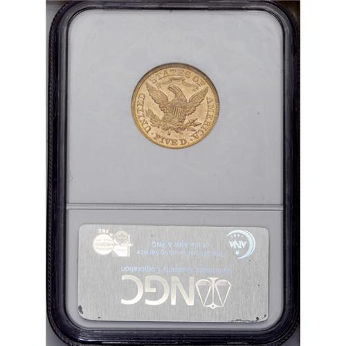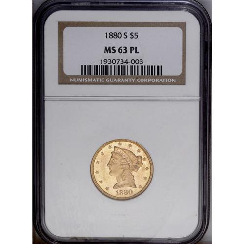 <B>1880-S $5 MS63 Prooflike NGC.</B></I> This sharply struck half eagle has medium salmon-pink toning, and only one relevant mark, above the olive branch, is found on the suitably reflective fields. Census: 5 in 63 Prooflike, 0 finer (1/06).