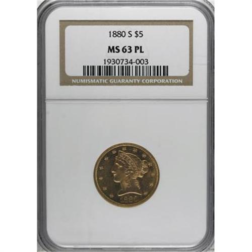 <B>1880-S $5 MS63 Prooflike NGC.</B></I> This sharply struck half eagle has medium salmon-pink toning, and only one relevant mark, above the olive branch, is found on the suitably reflective fields. Scarce in Prooflike condition, with none graded above MS63 by NGC. Census: 6 in 63 Prooflike, 0 finer in Prooflike (7/07). <BR><BR><B>Coin Engraver:</B> Christian Gobrecht<BR><BR><b>Shipping:</b> Coins & Currency (<a target="_blank" href="http://www.heritageauctions.com/common/shipping.php">view shipping information</a>)