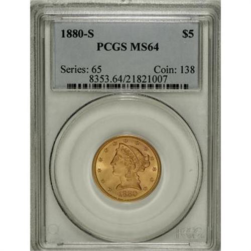 <B>1880-S $5 MS64 PCGS.</B></I> A sharply struck honey-gold Choice coin that offers uncommonly vibrant luster. Satiny with ample violet overtones in the pleasingly preserved fields. Registry enthusiasts should note that PCGS has graded only one finer example (3/08).<BR><BR><B>Coin Engraver:</B> Christian Gobrecht<BR><BR><b>Shipping:</b> Coins & Currency (<a target="_blank" href="http://www.heritageauctions.com/common/shipping.php">view shipping information</a>)