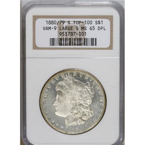 <B>1880-S S$1 8 Over 7 MS65 Deep Mirror Prooflike NGC.</B></I> VAM-9. A Top 100 Variety. Large S. The highly reflective reverse confirms the VAM-9, Large S designation. Sharply struck with a degree of contrast and small spots of haze over each side.<BR><BR><b>Shipping:</b> Coins & Currency (<a target="_blank" href="http://www.heritageauctions.com/common/shipping.php">view shipping information</a>)