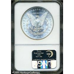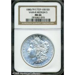 <B>1880-S<img border='0' src='http://www.heritagecoins.com/images/star.gif' width=10 height=10>$1 8 Over 7 MS66 NGC.</B></I> VAM-8. A Top 100 Variety. Medium S. A virtually brilliant premium Gem, pinpoint sharp and highly lustrous. Liberty's cheek is undisturbed. A popular VAM, one of several 1880-S die varieties suspected to be overdates. Lot:10010