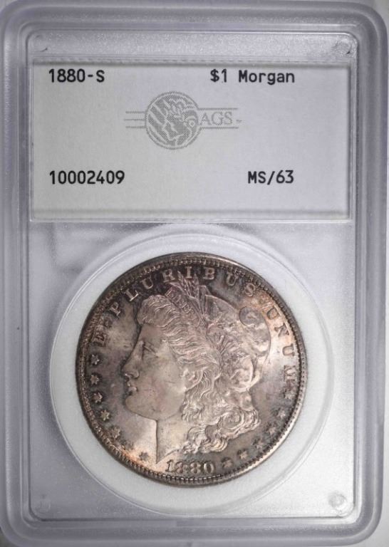 1880-S MORGAN SILVER DOLLAR, AGS CH BU ESTIMATE $65 - $80.