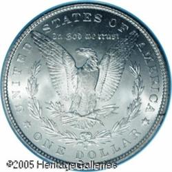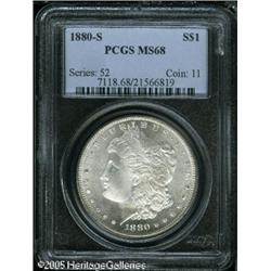 <B>1880-S<img border='0' src='http://www.heritagecoins.com/images/star.gif' width=10 height=10>$1 MS68 PCGS.</B></I> Large S. Like most Uncirculated 1880-S Silver Dollars, the present piece is sharply struck and highly lustrous. What distinguishes it from its peers is the uncommon preservation. Gorgeously smooth surfaces are further distinguished by hints of tan color. As of (1/05), just five pieces have been certified in finer grades by PCGS.<BR><I>From The Banks Collection.</B></I> Lot:10006