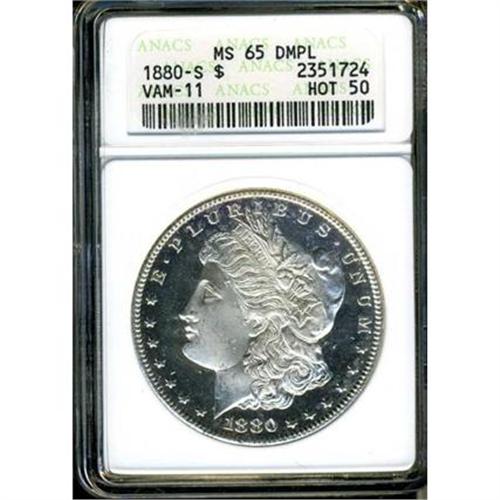 <b>1880-S Morgan Dollar. ANACS graded MS65 DMPL VAM-11 Hot 50.</b> Completely untoned with spectacular mint brilliance over pulsating "black on white" surfaces. A blunt impression is occasionally left by the recoil of the dies that struck this year's coinage; just the same, we can report that this specimen, far and above the others, is superior in its detail and eye-appeal <b>(PCGS # 97119)</b>