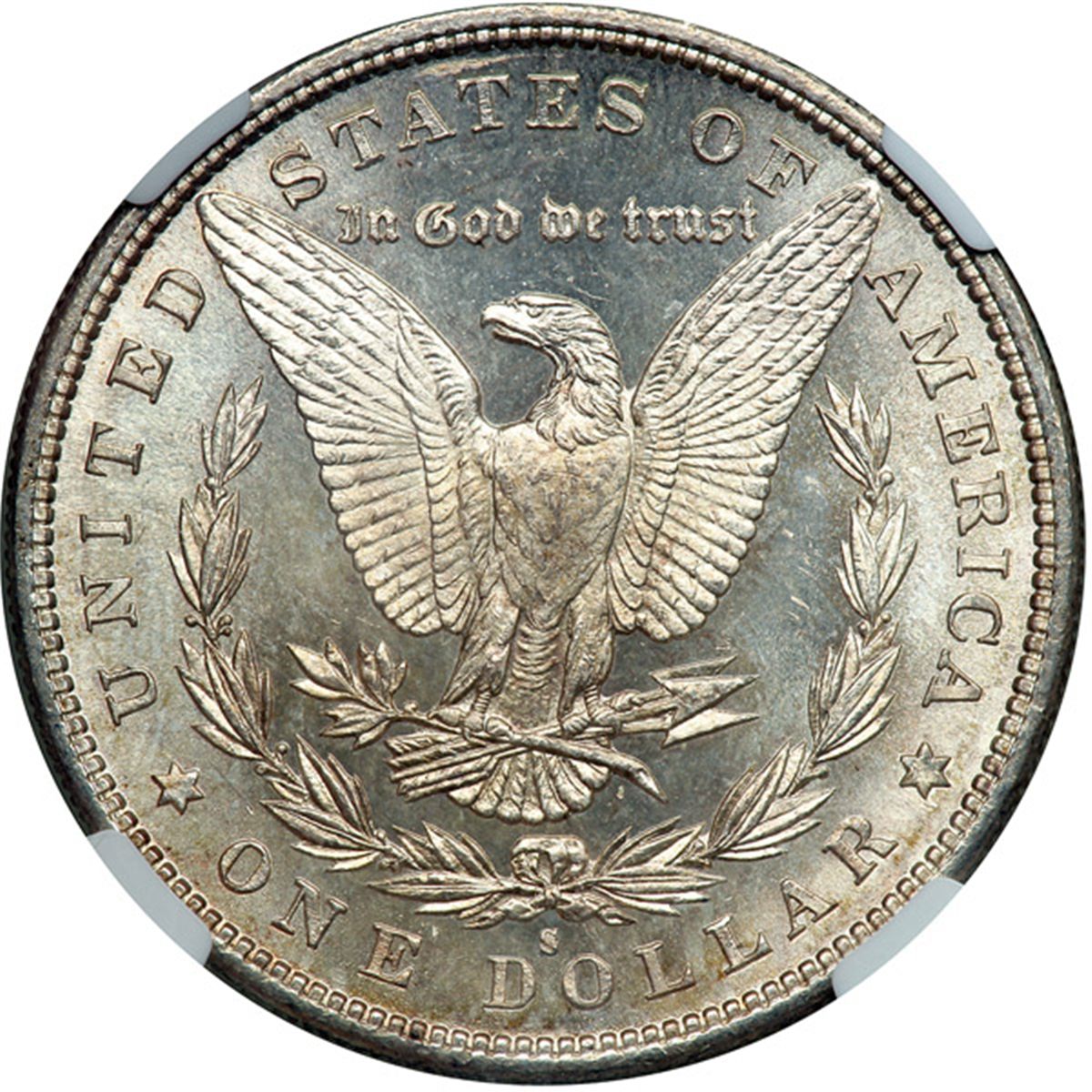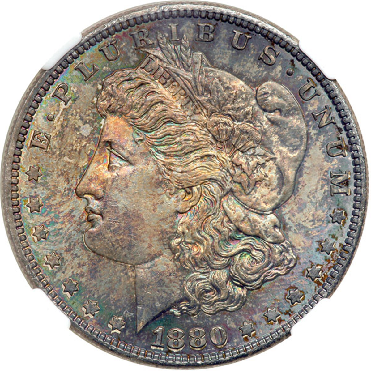 1880-S Morgan Dollar. NGC graded MS-64. The obverse displays green and dark colors while the reverse is almost completely white (PCGS # 7118) .