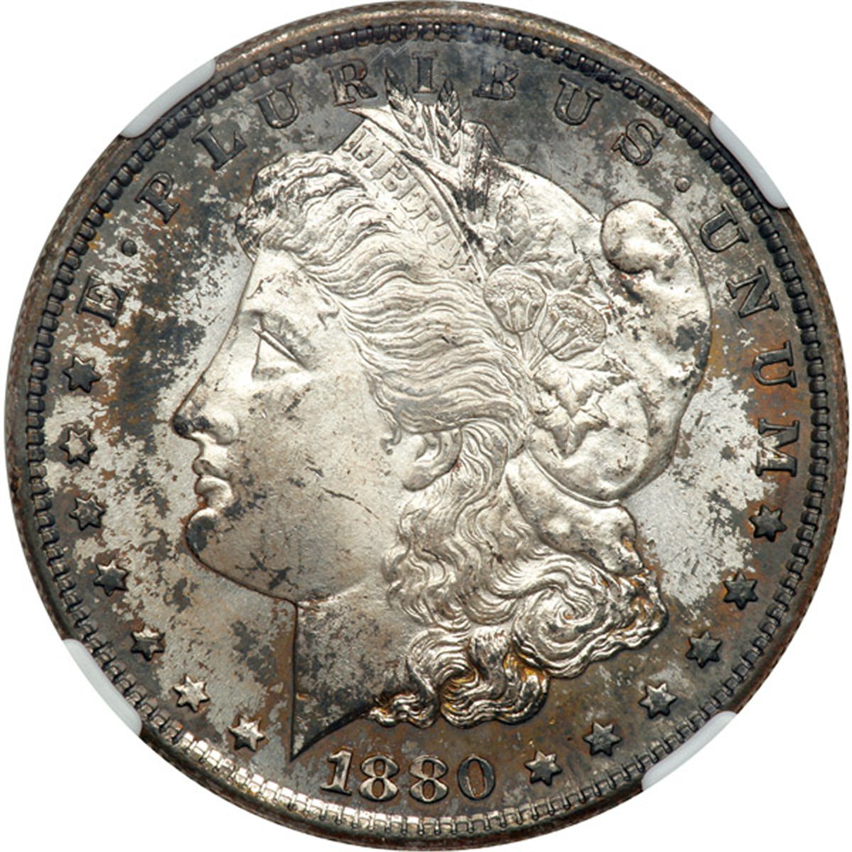 1880-S Morgan Dollar. NGC graded MS-64. Unusual gold toning here and there. Loaded with originality (PCGS # 7118) .