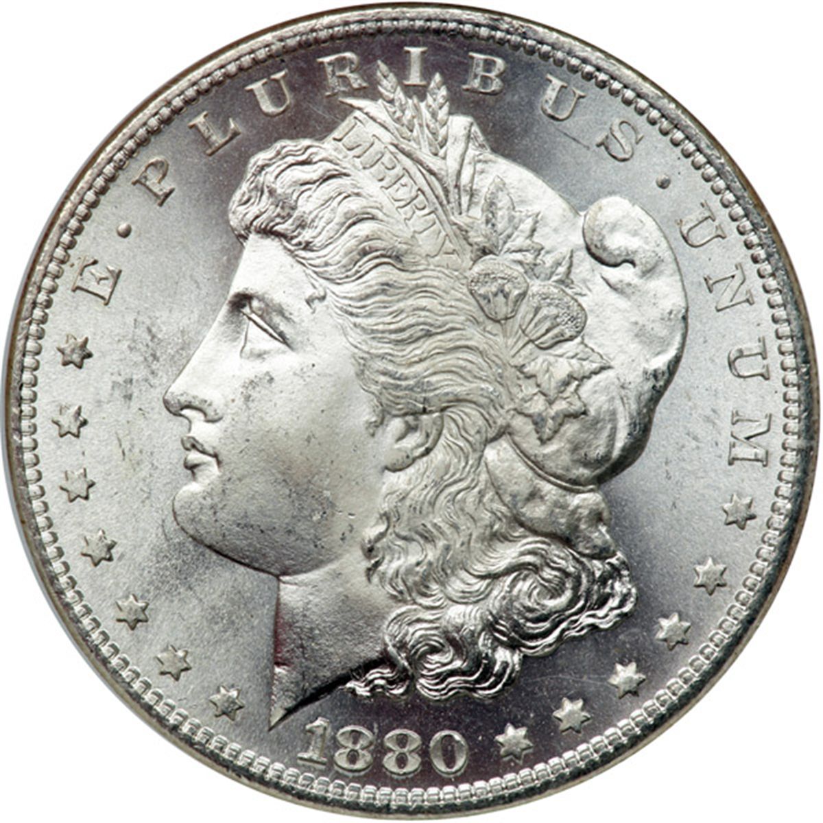 1880-S. NGC graded MS-67. A satiny gem and totally white, superb in every detail from the broad expanse of field to the tidy little waves and curls decorating Liberty's hair (PCGS # 7118) .