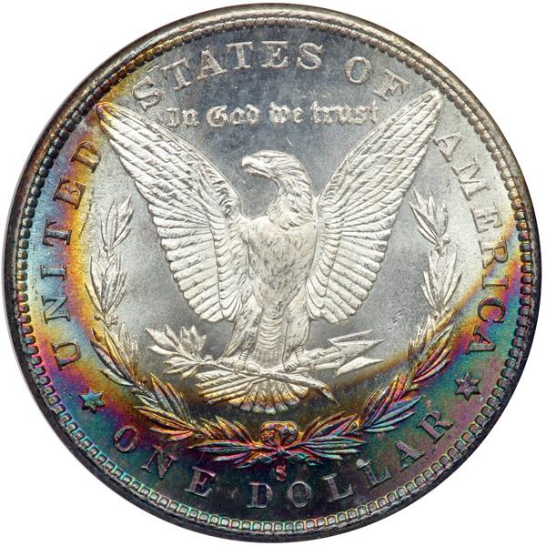 1880-S Morgan Dollar. NGC graded MS-68*. Superb! The obverse is mostly white while the reverse exhibits beautiful multi-dimensional toning emphasized nicely by glittering nearly mark-free surfaces. Pop 30; none finer (PCGS # 7118) .