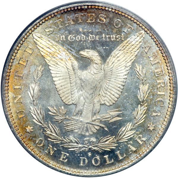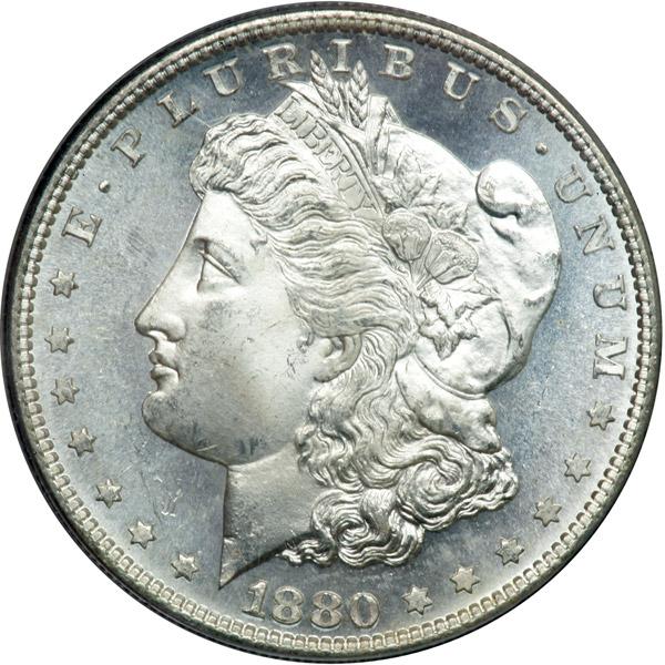 1880-S Morgan Dollar. PCGS graded MS-65 Prooflike. Housed in an Old Green Holder. A hint of gold tone on the reverse, the fields sparkle from the mirror finish (PCGS # 7119) .