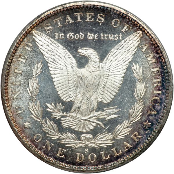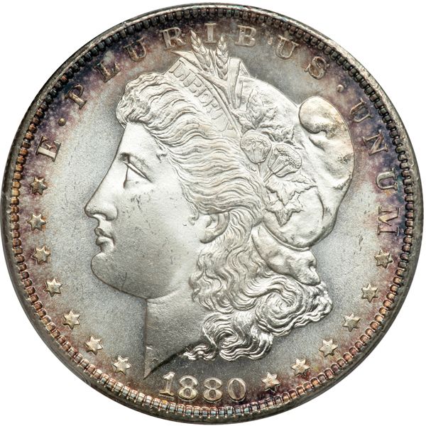 1880-S Morgan Dollar. PCGS graded MS-67 CAC Approved. A hint of gold tone around the edges. The reverse is semi-prooflike. A lovely coin that has only been graded once. Superb! (PCGS # 7118) .
