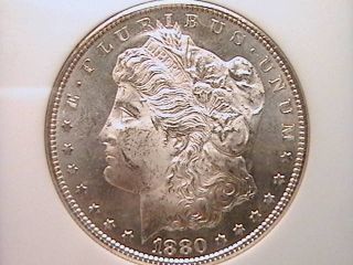 1880-S Morgan Dollar MS64 NGC. Beautiful reflective white surfaces and deep cameo devices