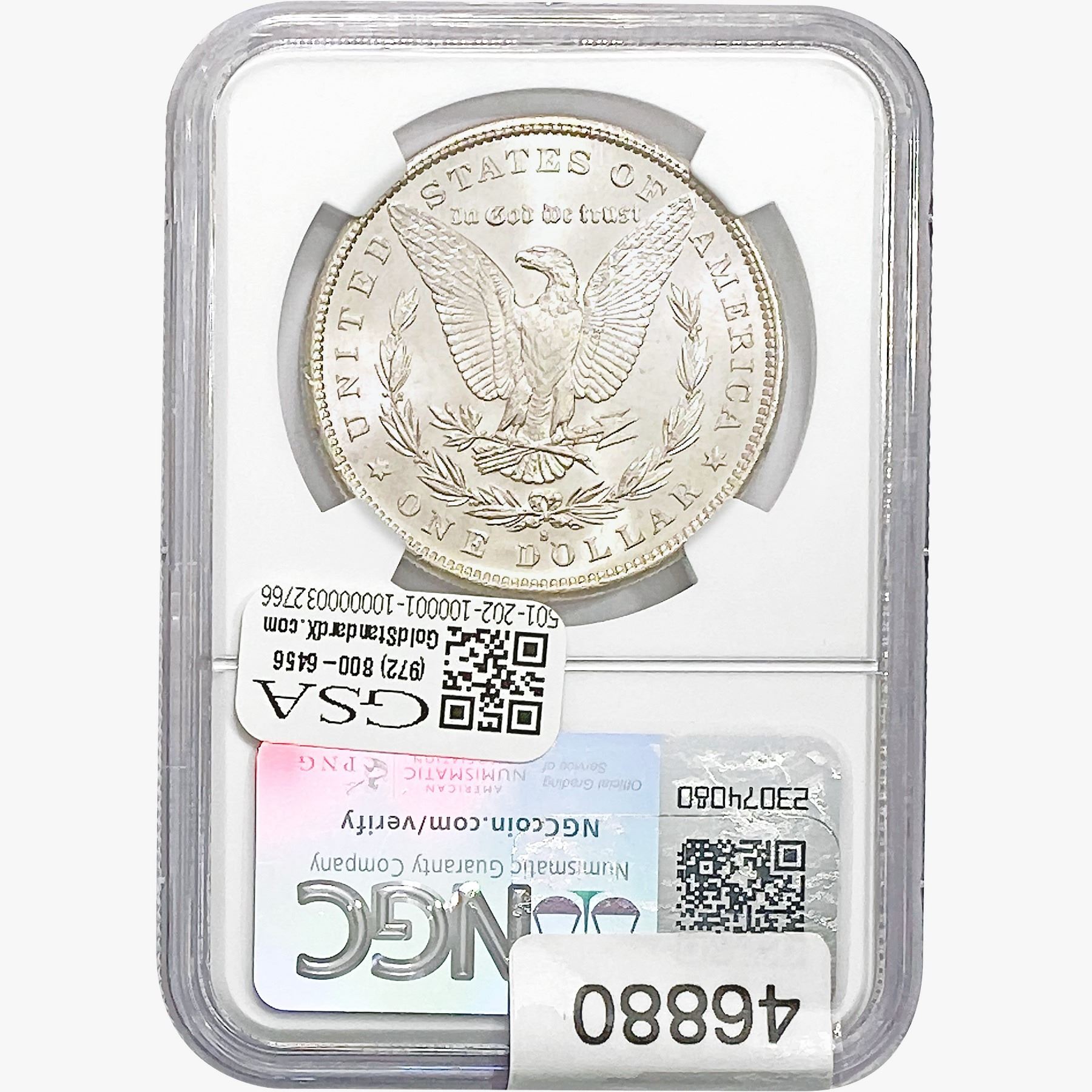 e. Coins sold referencing a third-party grading service are sold “AS IS” without any express or implied warranty, except for a guarantee by GSA that they are genuine. Removal or alteration of the holder, voids all of Bidder’s claims concerning that Product. Certain warranties may be available from the grading services and Bidders are referred to them for further details: Numismatic Guaranty Corporation (NGC), PO Box 4776, Sarasota, FL 34230, www.ngccoin.com/services/writtenguarantee.asp; Professional Coin Grading Services (PCGS), PO Box 9458, Newport Beach, CA 92658, www.pcgs.com/guarantee.html; ANACS, 6555 S. Kenton St., Ste. 303, Englewood, CO 80111; and Independent Coin Grading Co. (ICG), 7901 East Bellview, Ave., Suite 50, Englewood, CO 80111.