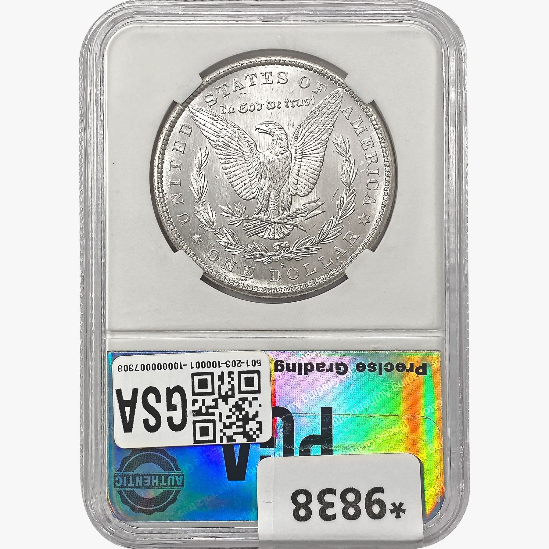 COINS AND CURRENCY LISTED IN GSA’S CATALOG AS GRADED AND ENCAPSULATED BY PCGS, NGC, ANACS, ICG, PCGS CURRENCY, PMG, PCGS BANKNOTE GRADING, CMC OR ANY OTHER THIRD-PARTY GRADING SERVICE ARE LIKEWISE SOLD “AS-IS” EXCEPT AS EXPRESSLY SET FORTH HEREIN. ALL THIRD-PARTY GRADING SERVICE GUARANTEES, INCLUDING AUTHENTICITY, ARE THE SOLE RESPONSIBILITY OF THE THIRD-PARTY GRADING SERVICE AND NOT WARRANTIES OR GUARANTEES OF GSA. BIDDERS SHOULD CONTACT THESE THIRD-PARTY GRADING SERVICES DIRECTLY WITH RESPECT TO ANY CLAIMS OR QUESTIONS THEY MAY HAVE CONCERNING THEIR GUARANTEES AND WARRANTIES. BIDDERS ACKNOWLEDGE AND AGREE THAT AUCTIONEER IS NOT BOUND BY OR LIABLE FOR ANY OPINION OR CERTIFICATION BY ANY THIRD-PARTY GRADING SERVICE. REMOVAL OF A PRODUCT FROM ITS PROTECTIVE CASING OR HOLDER OR ALTERATION OF ANY COIN HOLDER WAIVES ALL RIGHTS CONCERNING THE PRODUCT CONTAINED THEREIN.