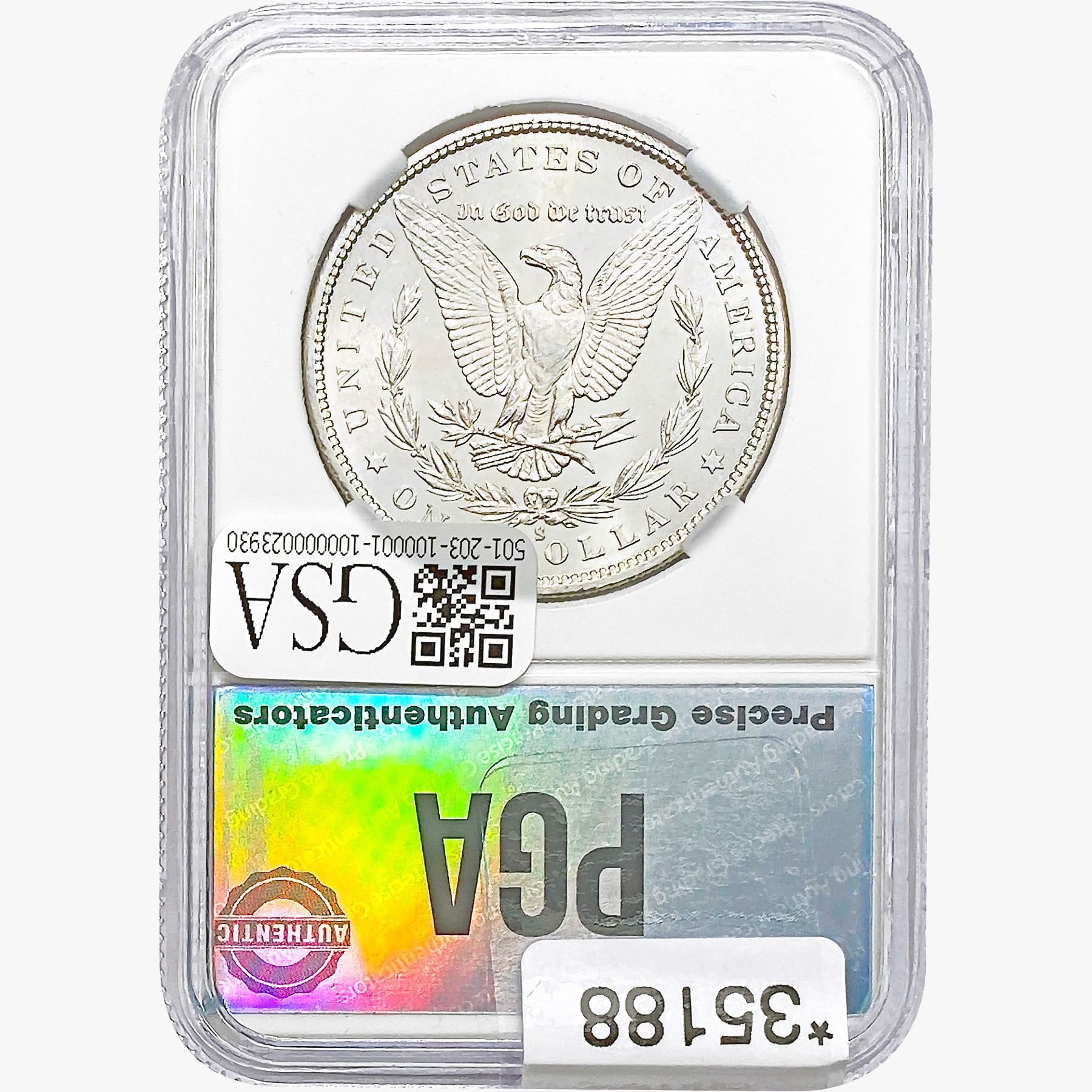 COINS AND CURRENCY LISTED IN GSA’S CATALOG AS GRADED AND ENCAPSULATED BY PCGS, NGC, ANACS, ICG, PCGS CURRENCY, PMG, PCGS BANKNOTE GRADING, CMC OR ANY OTHER THIRD-PARTY GRADING SERVICE ARE LIKEWISE SOLD “AS-IS” EXCEPT AS EXPRESSLY SET FORTH HEREIN. ALL THIRD-PARTY GRADING SERVICE GUARANTEES, INCLUDING AUTHENTICITY, ARE THE SOLE RESPONSIBILITY OF THE THIRD-PARTY GRADING SERVICE AND NOT WARRANTIES OR GUARANTEES OF GSA. BIDDERS SHOULD CONTACT THESE THIRD-PARTY GRADING SERVICES DIRECTLY WITH RESPECT TO ANY CLAIMS OR QUESTIONS THEY MAY HAVE CONCERNING THEIR GUARANTEES AND WARRANTIES. BIDDERS ACKNOWLEDGE AND AGREE THAT AUCTIONEER IS NOT BOUND BY OR LIABLE FOR ANY OPINION OR CERTIFICATION BY ANY THIRD-PARTY GRADING SERVICE. REMOVAL OF A PRODUCT FROM ITS PROTECTIVE CASING OR HOLDER OR ALTERATION OF ANY COIN HOLDER WAIVES ALL RIGHTS CONCERNING THE PRODUCT CONTAINED THEREIN.