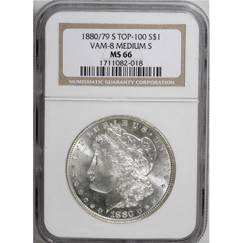 <B>1880-S<img border='0' src='http://www.heritagecoins.com/images/star.gif' width=10 height=10>$1> 8 Over 7 MS66 NGC.</B></I> VAM-8. A Top 100 Variety. Medium S. With great luster and a sharp strike, even for this issue, this coin is already a winner. The Top 100 overdate is a nice bonus, of course.