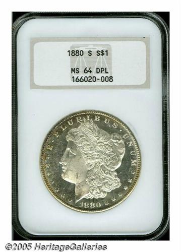 <B>1880-S<S$1> MS64 Deep Mirror Prooflike NGC.</B></I> Medium S. Impressive cameo frost and flashy mirrored fields demonstrate the magnificent eye appeal. Crisply struck and nearly undisturbed.