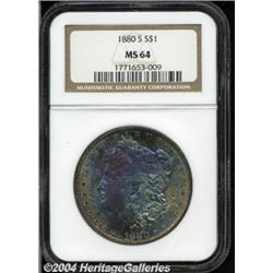<B>1880-S<S$1> MS64 NGC.</B></I> Perhaps the most attractive 1880-S Morgan dollar that we have seen, this near-Gem is well struck and vibrantly lustrous, with a deep layer of rainbow toning over both sides. Electric-blue, crimson, rose, and pale-green are among the most prominent colors on display, and the relatively few scattered surface blemishes are easy to overlook, amid the bright, beautiful patina. <BR><BR><B>Important notice:</B> Heritage usually auctions material at the rate of 200-250 lots per hour. On some occasions eBay Live bid software or the Internet may not be able to keep up with the pace of the auction. We recommend placing a realistic absentee bid now as insurance to avoid disappointment. Occasionally the auctioneer may eliminate or reject an eBay Live bid, and the auctioneer may also reopen a lot after the close of the eBay live bidding (usually because we missed an audience bid), and may reject your bid even if it shows you as the winning bidder. By bidding via eBay Live, you agree that Heritage may award the lot to another bidder at its sole discretion under the circumstances described above or any other reasonable circumstances. Since eBay bids are not shown to us until we open the lot on the floor, we treat those bids just like floor bids. In most cases the floor responds before the eBay bid is presented to us, due to Internet lag time, so for consistency we have made it a policy that floor bids are always considered first over tie eBay live bids. Also please note that all Heritage lots purchased through eBay Live carry a 20% Buyer's Premium. Please make sure you read the Terms and Conditions before you bid.