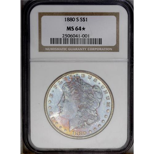 <B>1880-S<img border='0' src='http://www.heritagecoins.com/images/star.gif' width=10 height=10>$1> MS64 <img border='0' src='http://www.heritagecoins.com/images/star.gif' width=10 height=10> NGC.</B></I> The 1880-S in Mint State is one of the most common of the early Morgan dollar issues. Indeed, tens of thousands have been certified by NGC and PCGS combined in the Uncirculated grades. When the coveted Star designation is taken into account, however, the population decreases dramatically. About 130 near-Gems are assigned this status, with somewhere over 300 pieces grading finer with the Star (3/06). The MS64 coin offered here displays outstanding sky-blue, crimson, and gold-orange toning on the obverse, while the reverse is essentially untoned. The design elements are sharply impressed, and stand out against partially prooflike fields. A few minor scuffs on Liberty's cheek precludes an even higher grade. <BR><BR><B>Important notice:</B> Heritage usually auctions material at the rate of 200-250 lots per hour. On some occasions eBay Live bid software or the Internet may not be able to keep up with the pace of the auction. We recommend placing a realistic absentee bid now as insurance to avoid disappointment. Occasionally the auctioneer may eliminate or reject an eBay Live bid, and the auctioneer may also reopen a lot after the close of the eBay live bidding (usually because we missed an audience bid), and may reject your bid even if it shows you as the winning bidder. By bidding via eBay Live, you agree that Heritage may award the lot to another bidder at its sole discretion under the circumstances described above or any other reasonable circumstances. Since eBay bids are not shown to us until we open the lot on the floor, we treat those bids just like floor bids. In most cases the floor responds before the eBay bid is presented to us, due to Internet lag time, so for consistency we have made it a policy that floor bids are always considered first over tie eBay live bids. Also please note that all Heritage lots purchased through eBay Live carry a 20% Buyer's Premium. Please make sure you read the Terms and Conditions before you bid. This lot is being auctioned in conjunction with a live floor auction by Heritage Galleries & Auctioneers. All final auction and invoice information will be supplied by Heritage Galleries & Auctioneers, and all other information should be considered preliminary. Lot:3284 <BR><BR><B>Winning Notification and Billing:</B> After the FINAL session in this auction is complete, Heritage will send e-mail and snail mail invoices. This process normally takes several days. All final auction and invoice information will be supplied by Heritage Galleries & Auctioneers, and all other information should be considered preliminary. <BR><BR>This auction will be conducted on a live auction floor and over the Internet through eBay Live. If you choose to place an absentee bid, please take a moment to <font color='#0000ff'><u><a href='http://pages.ebay.com/liveauctions/help/before/laabsentee.html'>learn how eBay Live absentee bidding works</a></u></font><font color='#000000'>