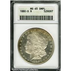 1880-S S$1 MS65 Deep Mirror Prooflike ANACS. Mediu <B>1880-S S$1 MS65 Deep Mirror Prooflike ANACS.</B></I> Medium S. Bright honey patina makes an occasional visit the peripheries of this flashy Gem. Well preserved and needle-sharp, as is characteristic of the issue. <BR><BR><B>Important notice:</B> Heritage usually auctions material at the rate of 200-250 lots per hour. On some occasions eBay Live bid software or the Internet may not be able to keep up with the pace of the auction. We recommend placing a realistic absentee bid now as insurance to avoid disappointment. Occasionally the auctioneer may eliminate or reject an eBay Live bid, and the auctioneer may also reopen a lot after the close of the eBay live bidding (usually because we missed an audience bid), and may reject your bid even if it shows you as the winning bidder. By bidding via eBay Live, you agree that Heritage may award the lot to another bidder at its sole discretion under the circumstances described above or any other reasonable circumstances. Since eBay bids are not shown to us until we open the lot on the floor, we treat those bids just like floor bids. In most cases the floor responds before the eBay bid is presented to us, due to Internet lag time, so for consistency we have made it a policy that floor bids are always considered first over tie eBay live bids. Also please note that all Heritage lots purchased through eBay Live carry a 20% Buyer's Premium. Please make sure you read the Terms and Conditions before you bid. This lot is being auctioned in conjunction with a live floor auction by Heritage Galleries & Auctioneers. All final auction and invoice information will be supplied by Heritage Galleries & Auctioneers, and all other information should be considered preliminary. Lot:7370