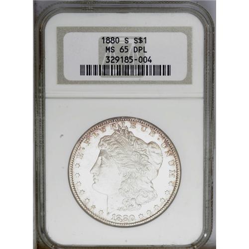<B>1880-S<img border='0' src='http://www.heritagecoins.com/images/star.gif' width=10 height=10>$1> MS65 Deep Mirror Prooflike NGC.</B></I> Large S. The needle-sharp devices are frosted, and rise above the glass-like reflective fields. Golden-rose peripheral toning further increases the eye appeal. Housed in a prior generation holder. <BR><BR><B>Important notice:</B> Heritage usually auctions material at the rate of 200-250 lots per hour. On some occasions eBay Live bid software or the Internet may not be able to keep up with the pace of the auction. We recommend placing a realistic absentee bid now as insurance to avoid disappointment. Occasionally the auctioneer may eliminate or reject an eBay Live bid, and the auctioneer may also reopen a lot after the close of the eBay live bidding (usually because we missed an audience bid), and may reject your bid even if it shows you as the winning bidder. By bidding via eBay Live, you agree that Heritage may award the lot to another bidder at its sole discretion under the circumstances described above or any other reasonable circumstances. Since eBay bids are not shown to us until we open the lot on the floor, we treat those bids just like floor bids. In most cases the floor responds before the eBay bid is presented to us, due to Internet lag time, so for consistency we have made it a policy that floor bids are always considered first over tie eBay live bids. Also please note that all Heritage lots purchased through eBay Live carry a 20% Buyer's Premium. Please make sure you read the Terms and Conditions before you bid. This lot is being auctioned in conjunction with a live floor auction by Heritage Galleries & Auctioneers. All final auction and invoice information will be supplied by Heritage Galleries & Auctioneers, and all other information should be considered preliminary. Lot:3299 <BR><BR><B>Winning Notification and Billing:</B> After the FINAL session in this auction is complete, Heritage will send e-mail and snail mail invoices. This process normally takes several days. All final auction and invoice information will be supplied by Heritage Galleries & Auctioneers, and all other information should be considered preliminary. <BR><BR>This auction will be conducted on a live auction floor and over the Internet through eBay Live. If you choose to place an absentee bid, please take a moment to <font color='#0000ff'><u><a href='http://pages.ebay.com/liveauctions/help/before/laabsentee.html'>learn how eBay Live absentee bidding works</a></u></font><font color='#000000'>
