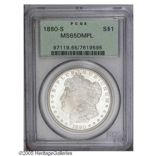 <B>1880-S<S$1> MS65 Deep Mirror Prooflike PCGS.</B></I> Medium S. An essentially brilliant and well struck Gem with exceptional eye appeal, courtesy of the prominently reflective fields, mildly frosty devices, and undisturbed surfaces.
