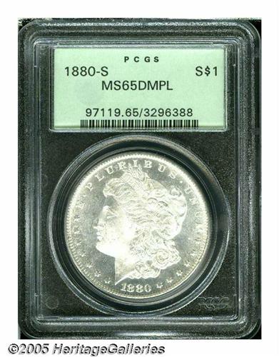 <B>1880-S<S$1> MS65 Deep Mirror Prooflike PCGS.</B></I> The white surfaces display very nice design to motif contrast, and are wonderfully preserved, with no significant marks. The design elements are sharply struck, including excellent definition in Liberty's hair strands.