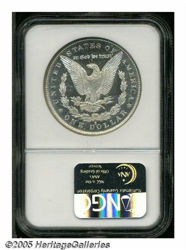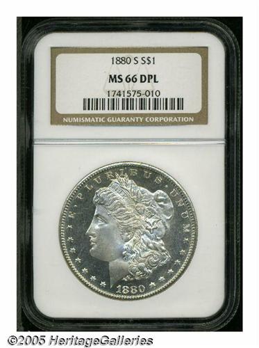 <B>1880-S<S$1> MS66 Deep Mirror Prooflike NGC.</B></I> Fully struck with bright fields and a showy, flashy appearance over both sides. The alabaster devices are nicely frosted and deeply contrasted against the surrounding dark mirrored fields. The piece shows a few minor field marks, but they are expectantly small both in number and size. A highly attractive Premium Gem dollar. Population: 93 in 66 Deep Mirror Prooflike, 14 finer (6/05).