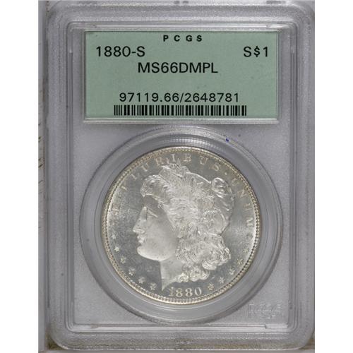 <B>1880-S S$1 MS66 Deep Mirror Prooflike PCGS.</B></I> Flashy and deeply reflective with heavy frost on the devices. A nearly brilliant Premium Gem that has exceptionally clean fields. Certified in a green label holder.<BR><BR><b>Shipping:</b> Coins & Currency (<a target="_blank" href="http://www.heritageauctions.com/common/shipping.php">view shipping information</a>)