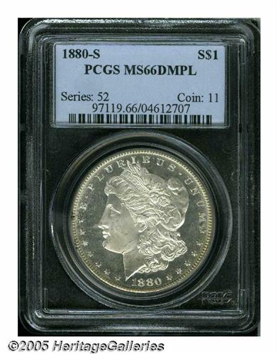 <B>1880-S<S$1> MS66 Deep Mirror Prooflike PCGS.</B></I> Medium S. This pinpoint sharp and delicately toned premium Gem displays imposing reflectivity in the fields, and the frosty devices possess only irrelevant contact.