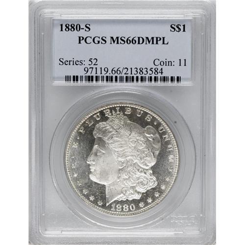 <B>1880-S S$1 MS66 Deep Mirror Prooflike PCGS.</B></I> Medium S. The icy devices are exactingly struck and exhibit obvious contrast with the glassy fields. This nearly brilliant silver dollar has impressive eye appeal.<BR><BR><b>Shipping:</b> Coins & Currency (<a target="_blank" href="http://www.heritageauctions.com/common/shipping.php">view shipping information</a>)