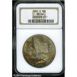 1880-S S$1 MS66 NGC. Medium S. Waves of iridescent <B>1880-S S$1 MS66 NGC.</B></I> Medium S. Waves of iridescent lemon, ruby-red, and forest-green color consume the reverse, while the obverse is nearly brilliant. An exquisitely struck and lustrous premium Gem. <BR><BR><B>Important notice:</B> Heritage usually auctions material at the rate of 200-250 lots per hour. On some occasions eBay Live bid software or the Internet may not be able to keep up with the pace of the auction. We recommend placing a realistic absentee bid now as insurance to avoid disappointment. Occasionally the auctioneer may eliminate or reject an eBay Live bid, and the auctioneer may also reopen a lot after the close of the eBay live bidding (usually because we missed an audience bid), and may reject your bid even if it shows you as the winning bidder. By bidding via eBay Live, you agree that Heritage may award the lot to another bidder at its sole discretion under the circumstances described above or any other reasonable circumstances. Since eBay bids are not shown to us until we open the lot on the floor, we treat those bids just like floor bids. In most cases the floor responds before the eBay bid is presented to us, due to Internet lag time, so for consistency we have made it a policy that floor bids are always considered first over tie eBay live bids. Also please note that all Heritage lots purchased through eBay Live carry a 20% Buyer's Premium. Please make sure you read the Terms and Conditions before you bid. This lot is being auctioned in conjunction with a live floor auction by Heritage Galleries & Auctioneers. All final auction and invoice information will be supplied by Heritage Galleries & Auctioneers, and all other information should be considered preliminary. Lot:7362
