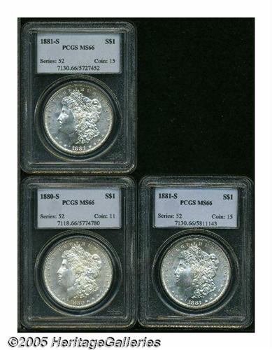 <B>1880-S<S$1> MS66 PCGS; 1881-S MS66 PCGS; </B></I> and an <B>1881-S MS66 PCGS,</B></I> all coins are well defined, brilliant, and devoid of mentionable marks.