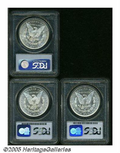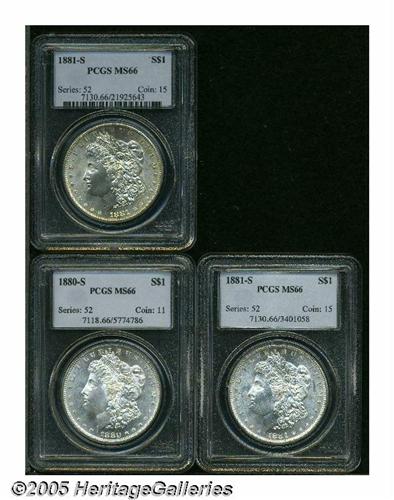 <B>1880-S<S$1> MS66 PCGS; 1881-S MS66 PCGS;</B></I> and an <B>1881-S MS66 PCGS,</B></I> all coins are sharply struck, and one of the 1881-S coins displays light champagne color, with the other two pieces remaining brilliant.